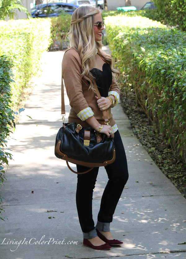 As the 4 of us were putting together this collab and bouncing ideas off of one another regarding trends to feature, I came up with ‘graphic sweaters’ with this specific heart number in mind. I’m obsessed. I wanted to bring a bit of color to the outfit, so I paired it with a yellow gingham button down to brighten and cranberry flats in keeping with a fall color palette.