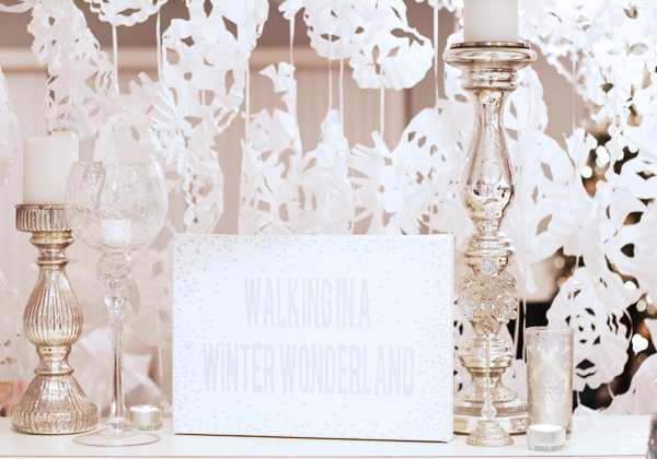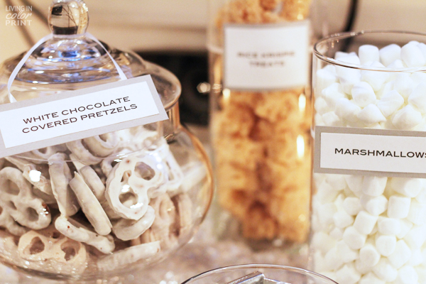 Several weeks back Sterling & I hosted a Winter Wonderland themed White Party at our place and I’ve been dying to share all the decor with y’all! It was an intimate gathering of friends but just like everything I do, I do it up big – handmade strung snowflakes {with the help from Nicholl}, champagne bar with fresh fruit fit for muddling, liquor station, food labels, candy bar, etc. – all color coordinated of course.