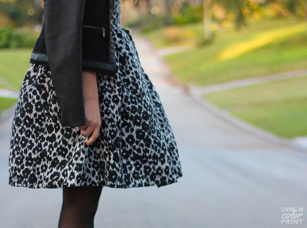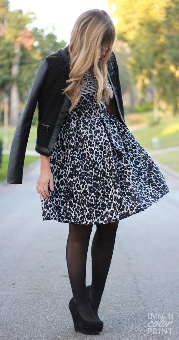 During my last visit to NYC, I picked up this darling Black + White Cheetah dress by One Dress a Day which ended up being a perfect fit for Thanksgiving with the fam. Super cool concept here – the brand actually launches a new dress style every. single. day, although they still allow you to shop past dresses you may have missed as well. I paired it with simple black pieces to let the black + white mixed patterns remain the focal point.