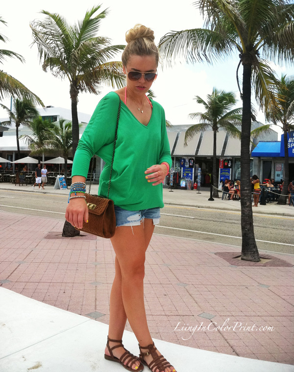 Cut off shorts: Hollister {old} // Shirt: c/o Benii Boutique // Sandals: Madden Girl // Cognac Cross Body: c/o Benii Boutique // Arm Candy: H&M, c/o Mono & Me Bracelets, Lucky brand turquoise wrap // Sunnies: Steve Madden via Marshalls // Necklace stack: c/o Miriam Merenfeld initial necklace, c/o DVN clover necklace