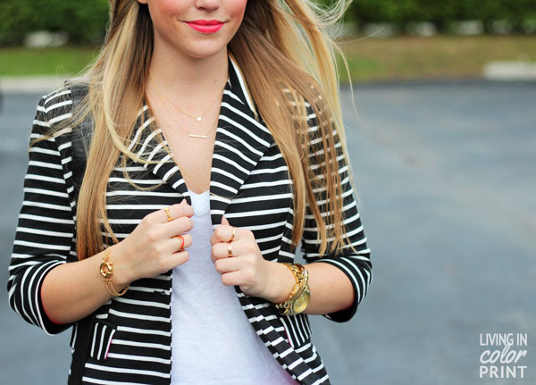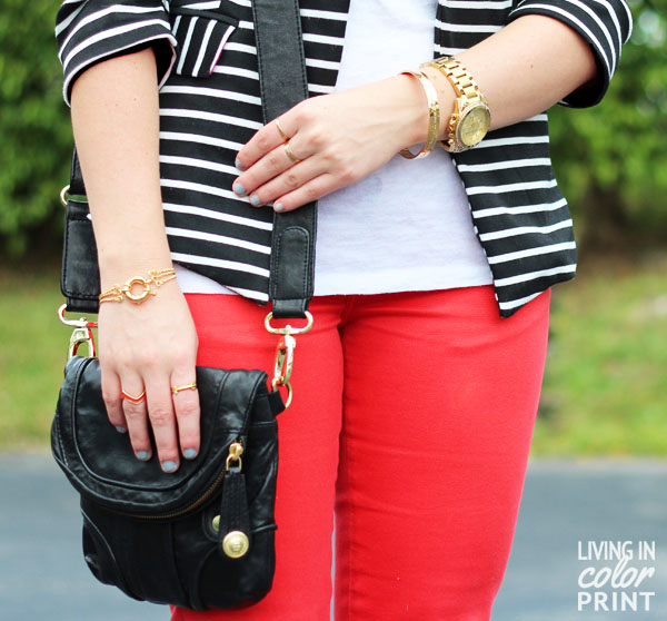 I adore this blazer, yet sometimes it seems to get lost in my closet, but it seriously goes with everything! Super simple here – paired with deep coral skinnies. Don’t have coral skinnies? Black & white pieces {whether it’s stripes or polka dots} can be paired with an colored denim for an added pop. I added some gold bling, always required, by Tryst Jewelry, Delia Langan, and Vivienne Kelly.