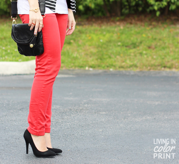 I am LOVING this look. The stripes are super cute with the colored pants!