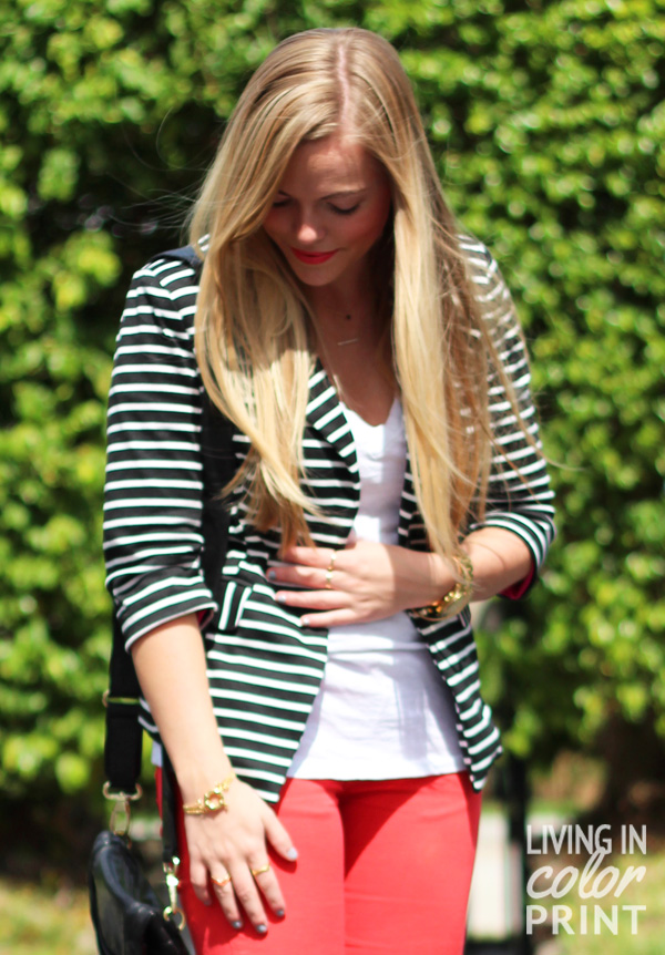 Striped blazer and colored skinnies=perfect combo! Love this look:)
