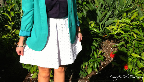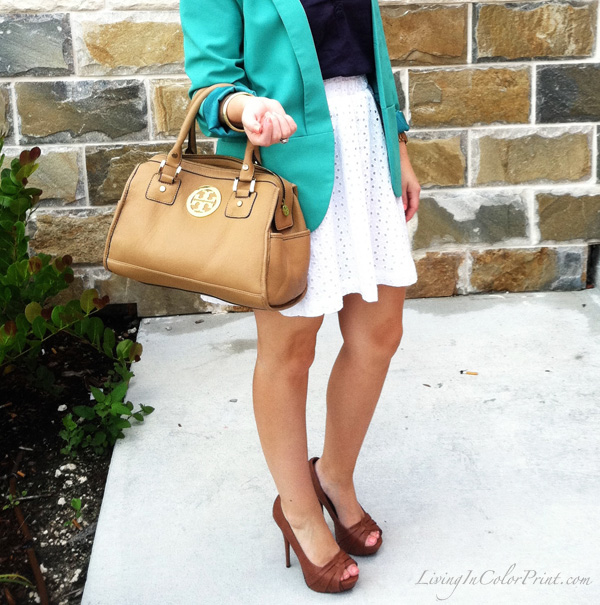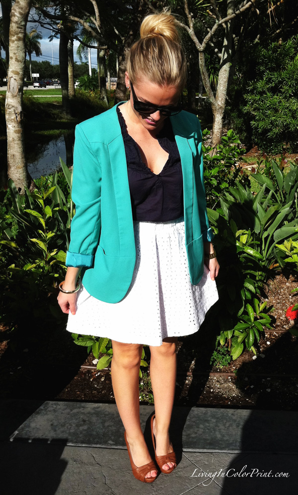 I’ve had this adorable eyelet skirt for a while {on clearance at Target!}, but it was somehow lost in my closet until this morning. I paired it with a simple navy top and mint blazer {one of my favorite color combos}. Whipped my hair into a bun, threw on a pair of my go-to work heels and BAM – my definition of a perfect, feminine 9-5 look.