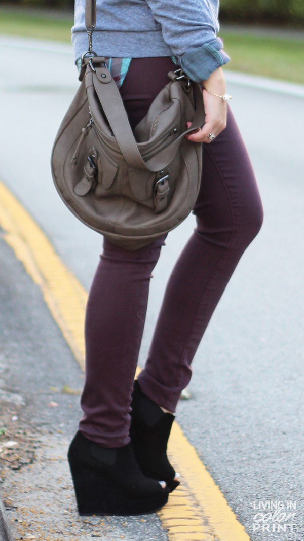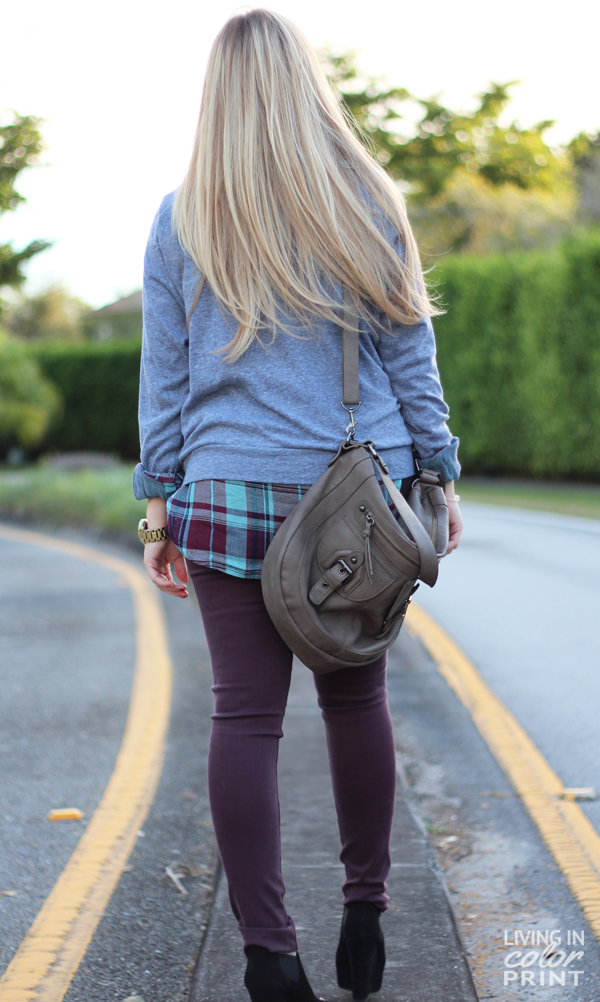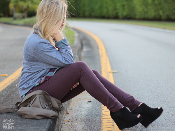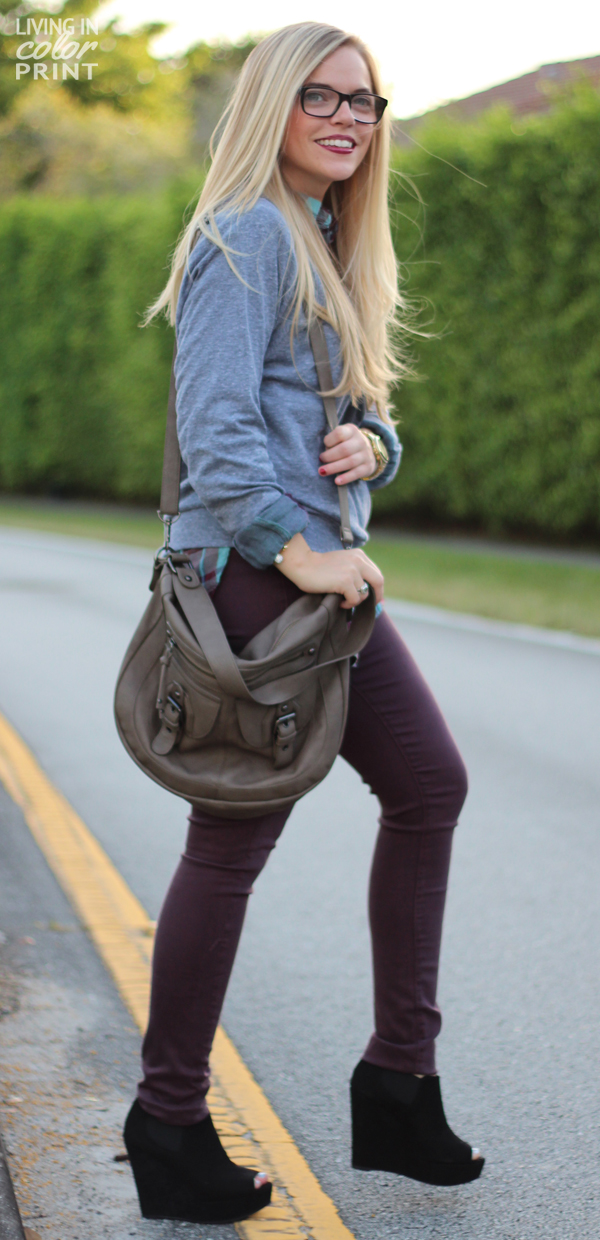 I’m loving the colors peeking out from that plaid top! And the slate gray bag was a great choice to anchor it all together. Super cute look!