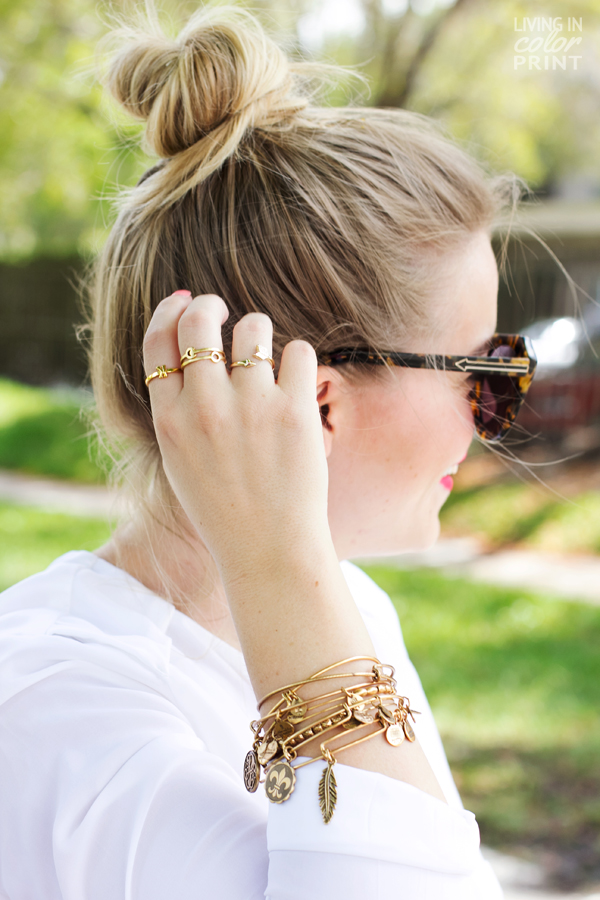 Love your Alex and Ani stack… so pretty! Just starting to collect a few, starting with my daughter and son’s birthstone (same month). Can never go wrong with a classic outfit plus a bold lip and chic up ‘do!