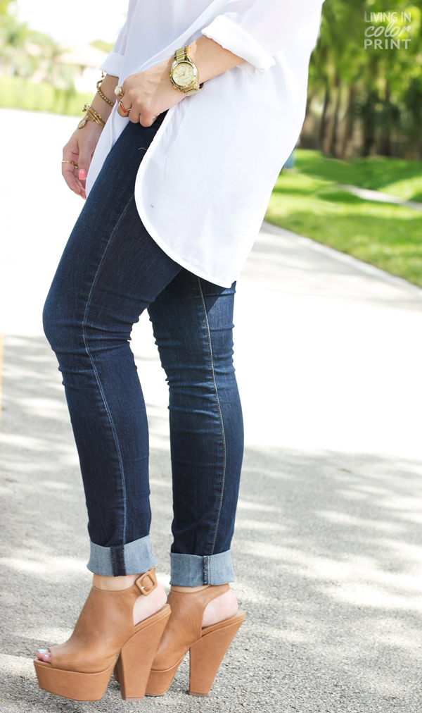 I have a very similar go to effortless outfit – something about denim, white and tan wedges that never gets old