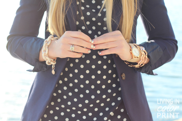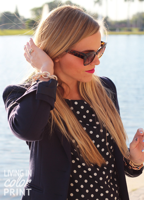 Blazer: H&M {similar} // Blouse: J Crew {identical} // Pants: Target {similar} // Pumps: G by Guess {similar} // Armcandy: Pave Bracelet c/o Derng, Chevron Bangles c/o Sassy and Sophisticated, Wrap Watch: c/o Sasha Rhett // Sunnies: SF Boutique // Lips: c/o Mirabella ‘Over the Top’ // Nails: Essie ‘No Place Like Chrome’
