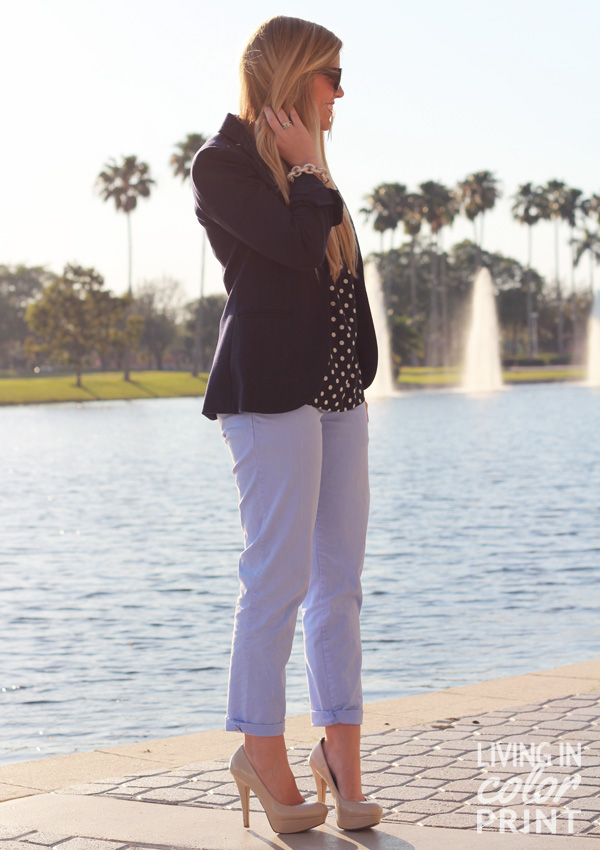I absolutely love navy; for every season – it’s a classic hue that goes with pretty much everything. Although I work primarily from home, when I do need to go into the office I like to incorporate classic pieces with a pop of the unexpected. Pairing these soft, spring-like lavender crop pants with a tailor navy blazer is a great way to accomplish such a look.
