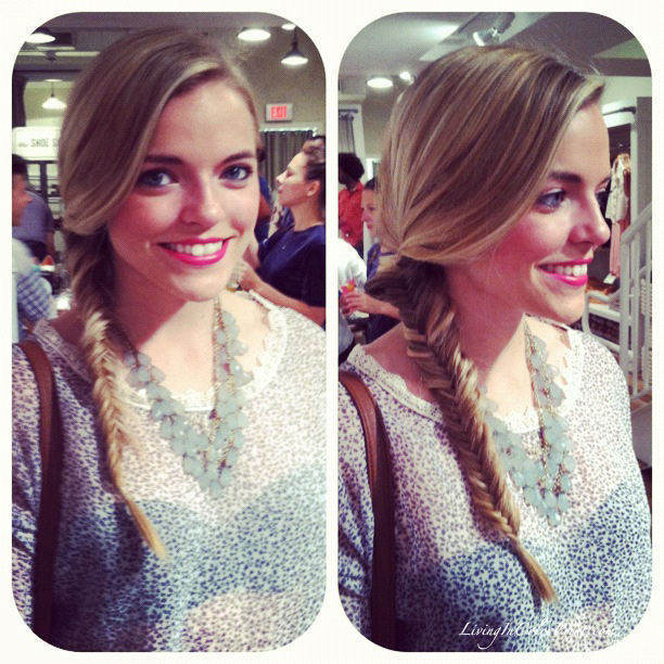 Last night I had the pleasure of attending the debut of ‘Style Sessions’ at Miami’s very own Madewell on Lincoln Rd. It was a great opportunity to check out the new Summer 2012 Collection, while catching up with fellow blogger friends & meet some new ones! The Madewell staff did a fantastic job organizing a laid back night filled with champagne, mimosas, macaroons, and a fab braid bar (c/o The Cutler Salon). Not to mention stellar ‘secret sales’ on colored chambray button downs, dresses, and more! Usually I’m a little apprehensive about getting my hair done at events, but I was feeling adventurous – hence this AMAZing fishtail braid, see below, {still wearing today by the way hehe…I’m clearly in love}.