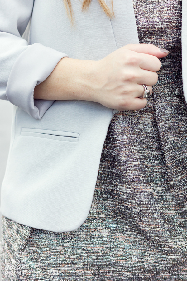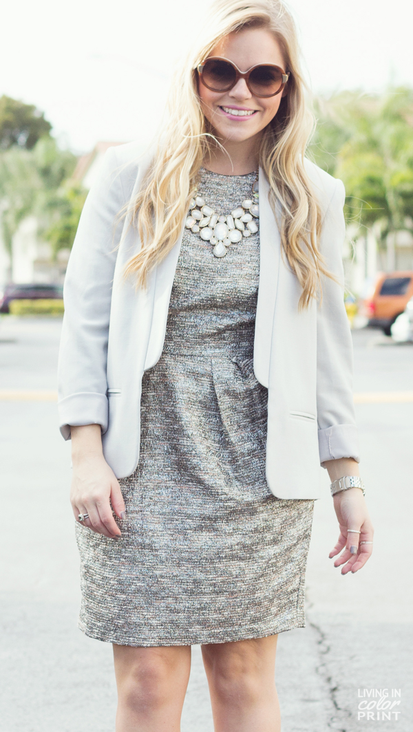 There’s something so playful about mixing textures that I absolutely love. This tweed metallic dress + soft grey blazer + front cut-out booties is a whole lota’ different, but they all seem to come together nicely in the end!![]()