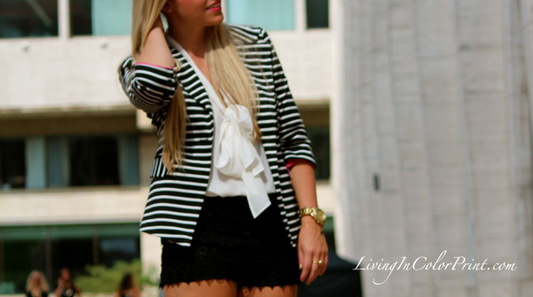 Black Lace Shorts: c/o Marshalls {similar} // White Bow Blouse: Old Navy {similar HERE & HERE} // Black & White Stripe Blazer: Marshalls {similar} // Wedges: Steve Madden // Armswag: Flora c/o BFREND, Michael Kors Watch, c/o MMJ Initial Bracelet