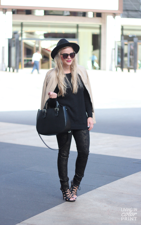 I digress…today’s look is another from the NYFW round, something a little different {and possibly} unexpected from this ‘girly girl’. The post title was inspired by my girl Christina of Oh So Glam who literally didn’t recognize me from behind is this get-up {Kristin…in all black && a hat?!} haha. Yes yes, I may be shifting to the darker side of things today, but I actually really liked how this overall look turned out! I’m totally obsessed with these new metallic snakeskin James Jeans and couldn’t think of a better pairing than a little ‘New Yorker’ flair.
