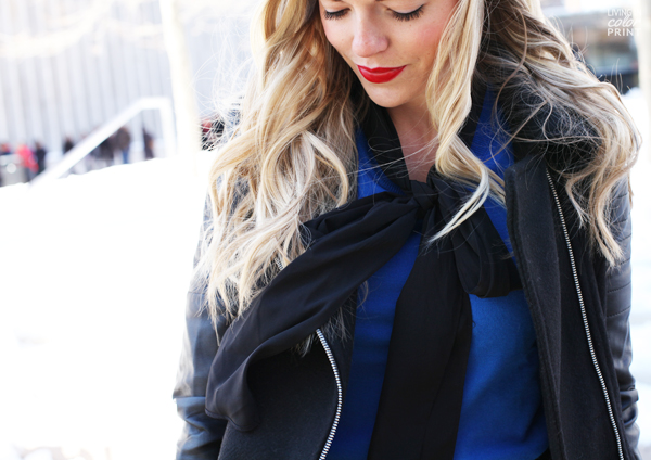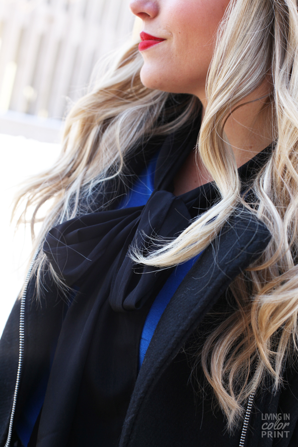 Patterned Pants | similar Cobalt Sweater | Bow Blouse {similar} | identical Leather Sleeve Jacket | Black Suede Pumps {old, similar} | Light It Up Lipstick c/o