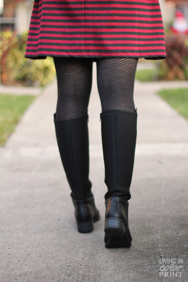 I’ve been searching for the perfect pair of ‘riding style’ boots for a while – let’s be real, I’m a bit picky. But when these Kelly & Katie boots came in I fell in love with the multi-texture of leather in the front + a stretchy fiber in the back. They’re great with printed/textured tights {as I’ve done here} or a fun sock, just to give them some pazzaz!