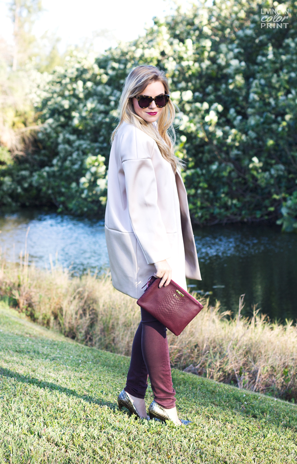 French Connection Coat c/o {runs bit; wearing a ‘0’} | Paige Denim Skinnies c/o {old, similar} | similar Metallic Pumps | GiGi New York Clutch c/o | Tom Ford ‘bruised plum’ Lips c/o | Karen Walker Sunnies