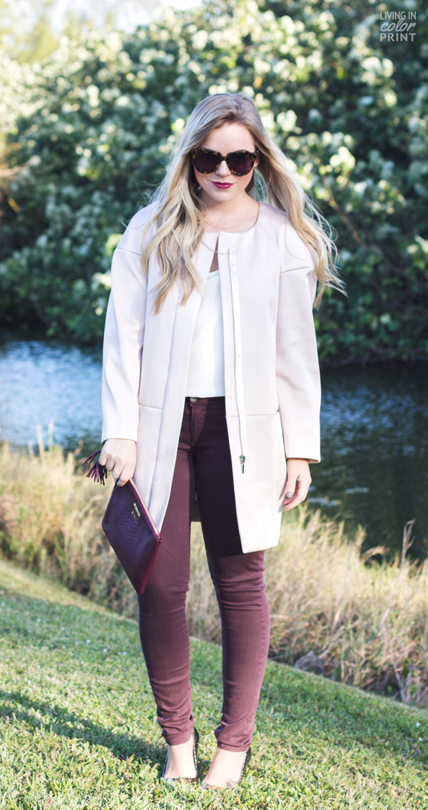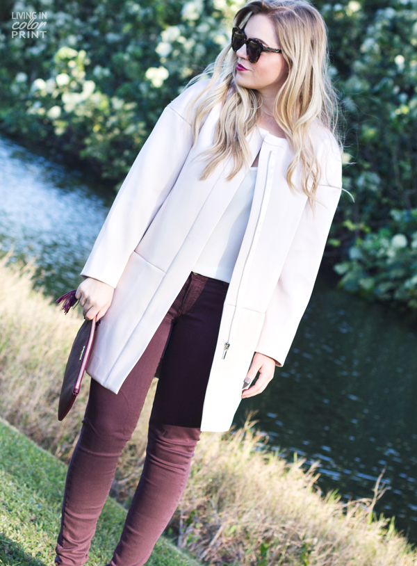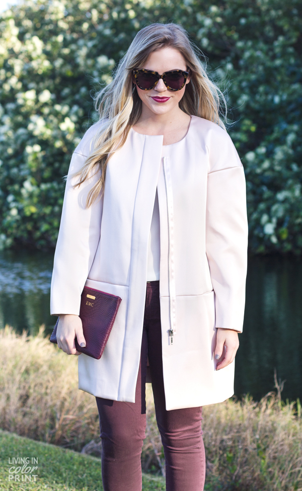 I’m absolutely loving the ‘boxy coat‘ look that’s taken over the runway and is finally hitting main stream stores in a major way. This French Connection pale pink option is perfect – combining an interesting new silhouette + a soft hue that’s a great fit for both winter {all about the winter pastels} and spring! I opted to pair it with dark plum skinnies to keep in line with ‘winter’, although spring is literally around the corner and I can’t wait!![]()