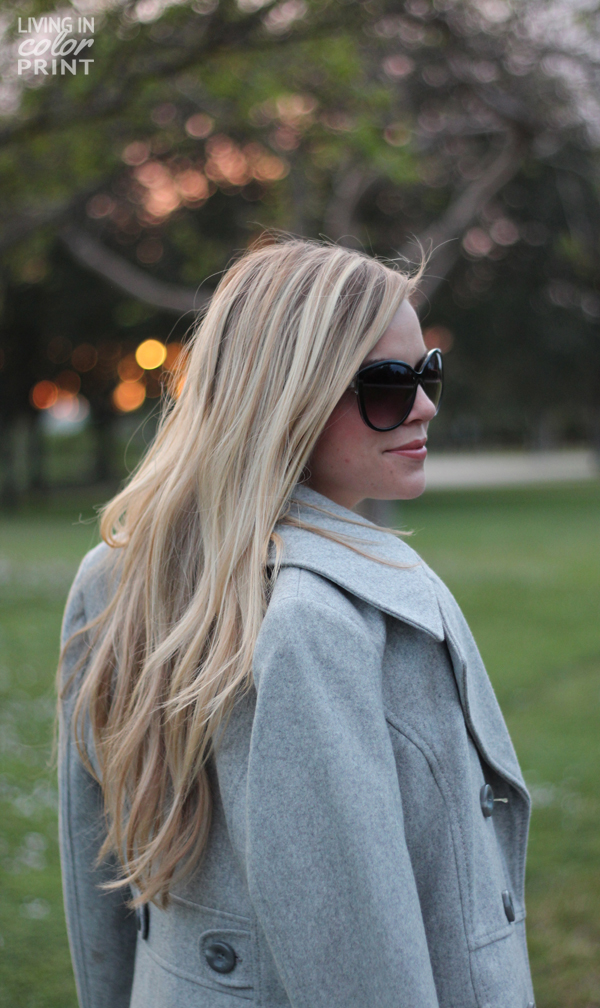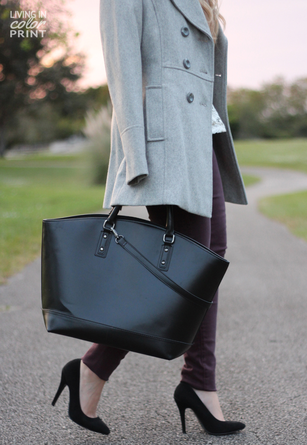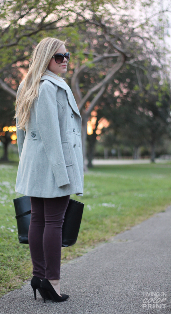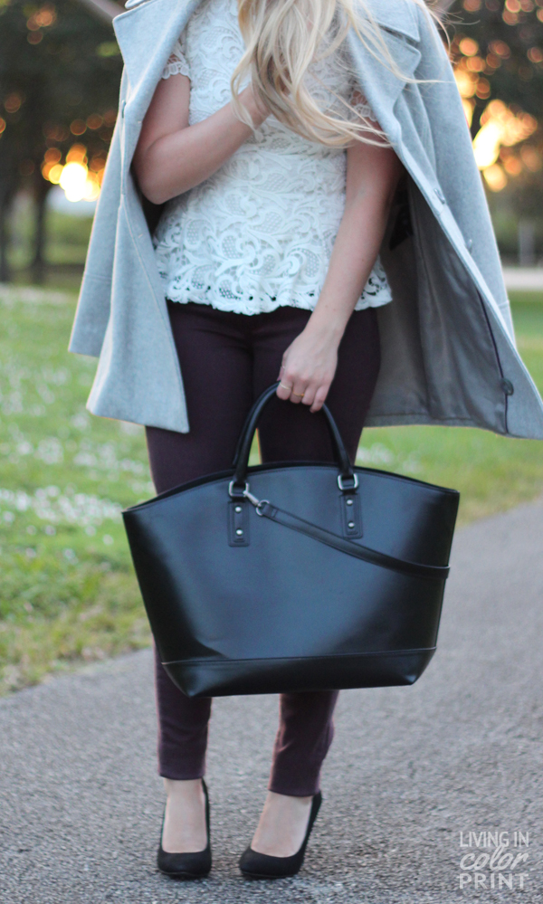 I love the way this light grey coat matches with almost everything in my wardrobe; it’s the perfect shade of heather grey. I’ve paired it with a delicate lace peplum top {short sleeve for during the day}, plum hued skinnies, and basic black accessories to anchor the look.