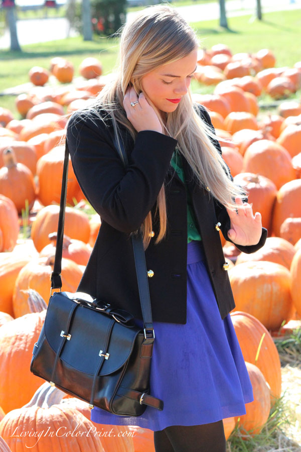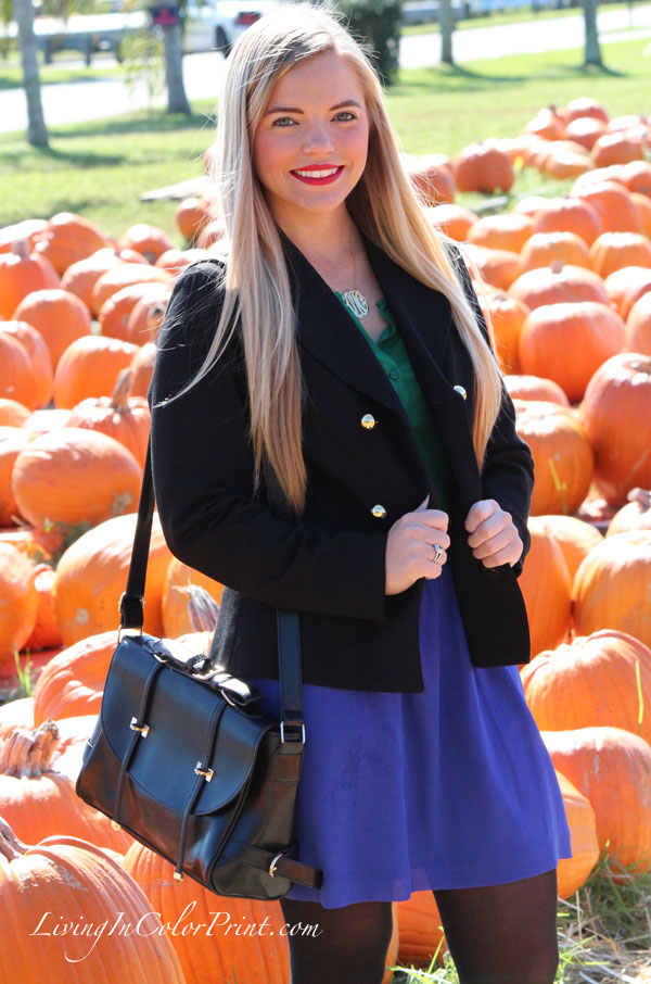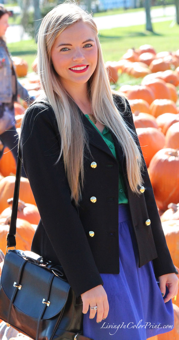 Love the jewel tones in this outfit, and the coat is so cute with it’s gold buttons! Love it!