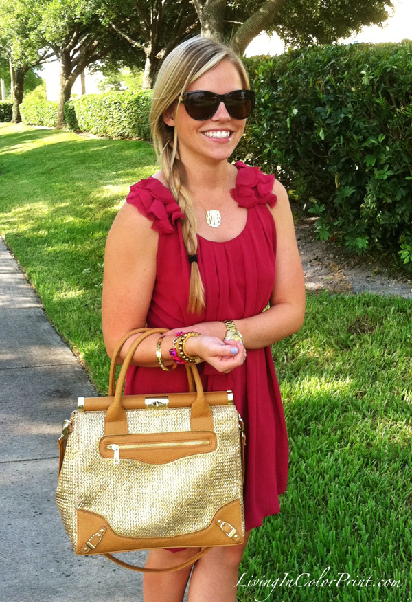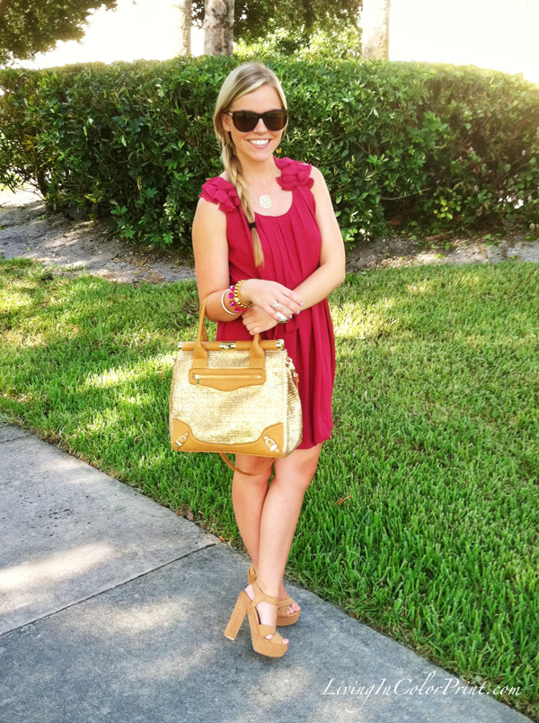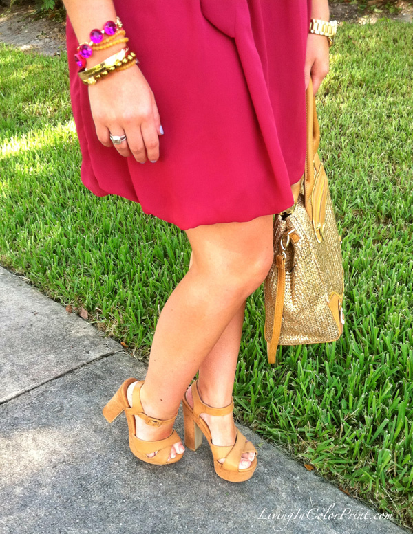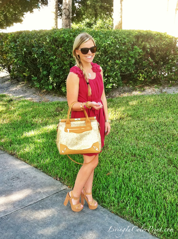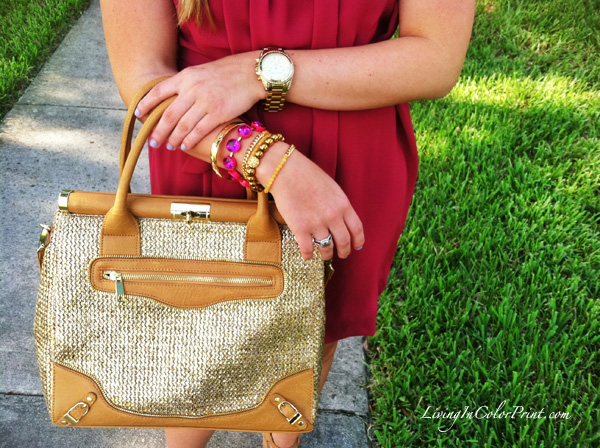 This week has been full of excitement, I just love those weeks. Work has been busy, my inbox in constantly full, and I have still be able to squeeze in some shopping {YES!} Today I’ve put together a typical workday outfit: easygoing feminine dress and a sassy pair of summery heels. Plus I also decided to debut my new ‘Miss Priss’ Olivia + Joy satchel I purchased via Ideeli. When I first got this bag I thought it was a bit too much, hence why you haven’t seen it until now. But it’s growing on me and I’ve decided it’s a keeper – just something that shouldn’t compete with an outfit, because let’s be honest, there’s A LOT of gold straw going on here. Stay tuned to see how I continue pairing it with other pieces.