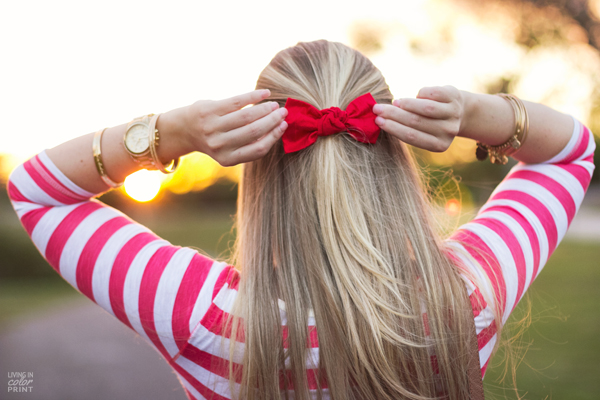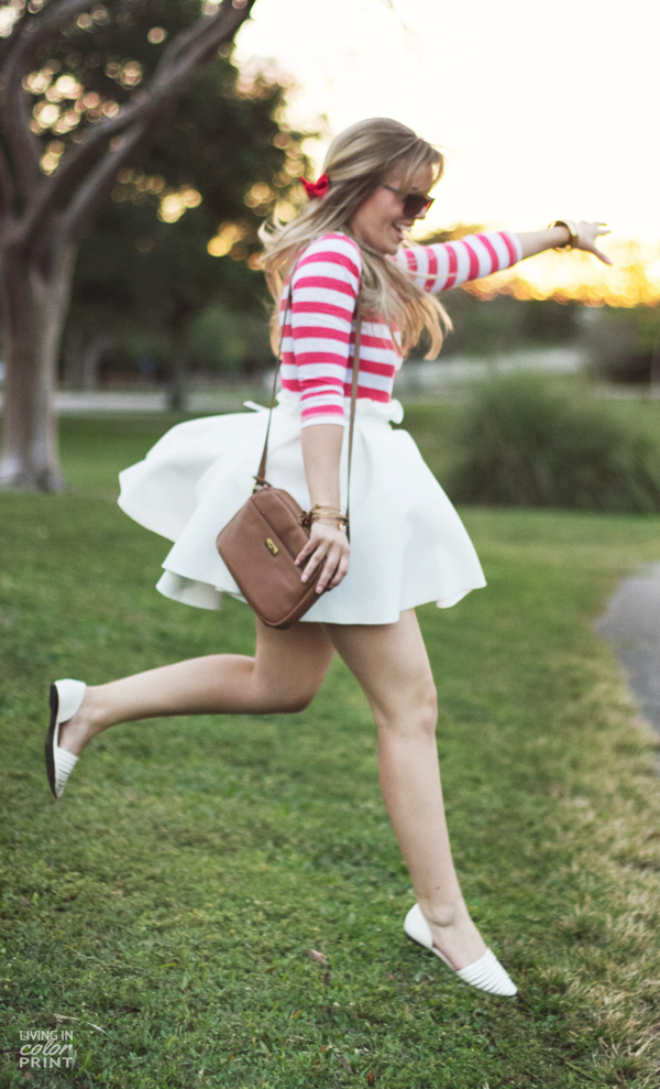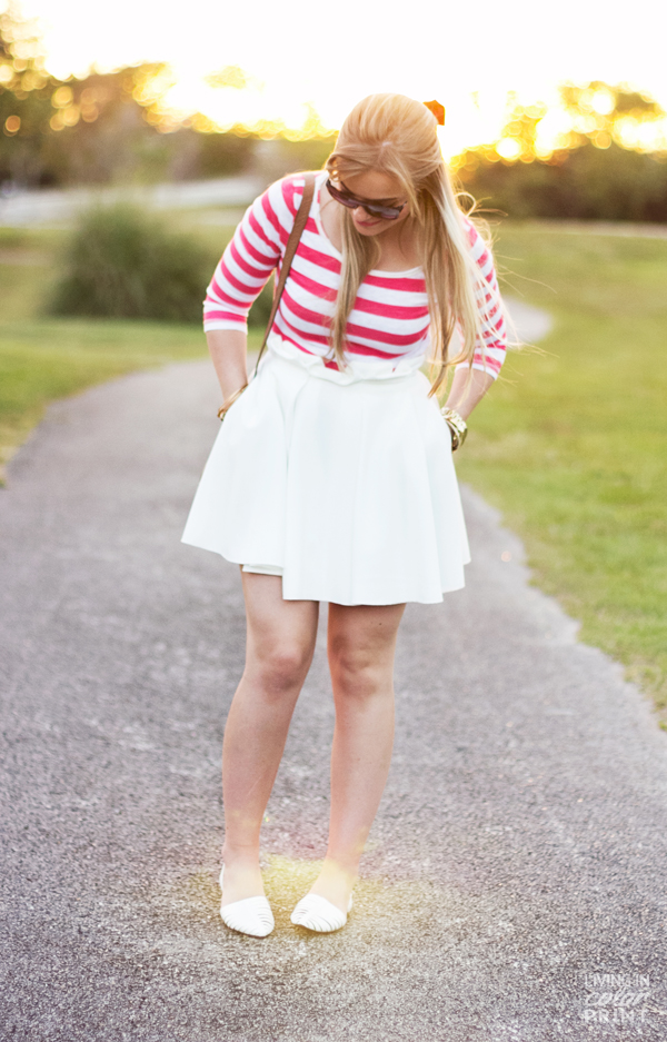 Torn by Ronny Kobo Skirt c/o | Stripe Shirt c/o Aeropostale {another option – both under $10!} | White Flats c/o Aeropostale | Hair Bow c/o Gina Made It | Crossbody {old, similar} | Karen Walker Sunnies | Smashbox ‘starlit’ Lips | Bracelet stack c/o The Jeweler’s Wife