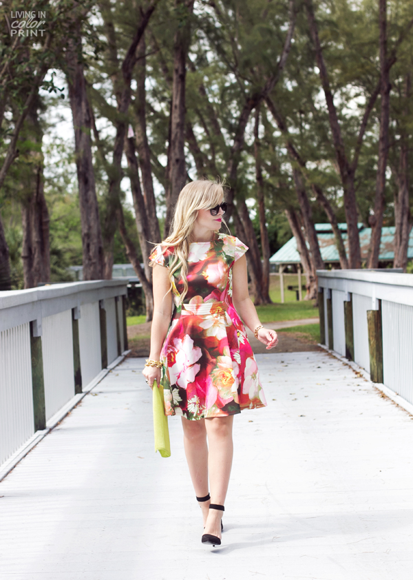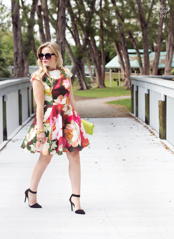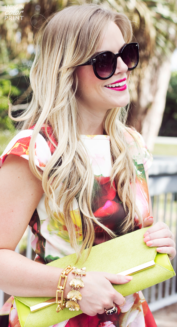 Rose Print Dress c/o Ted Baker | Clutch c/o Ted Baker | Sunnies c/o | Heels c/o Call It Spring | Kendra Scott Cocktail Ring c/o | Link Bracelet c/o | Pearl Detail Bracelet c/o