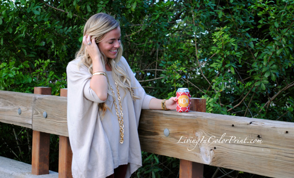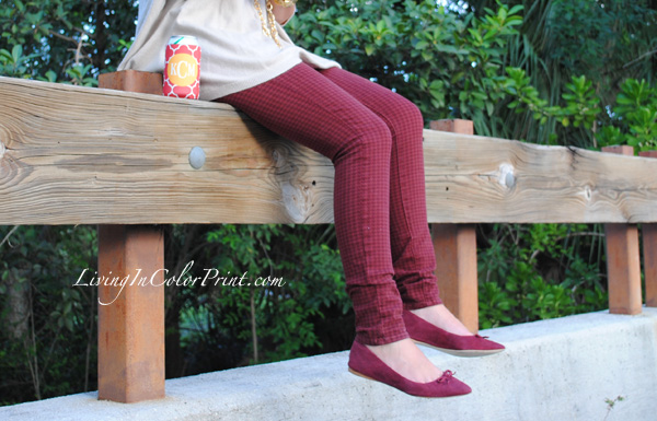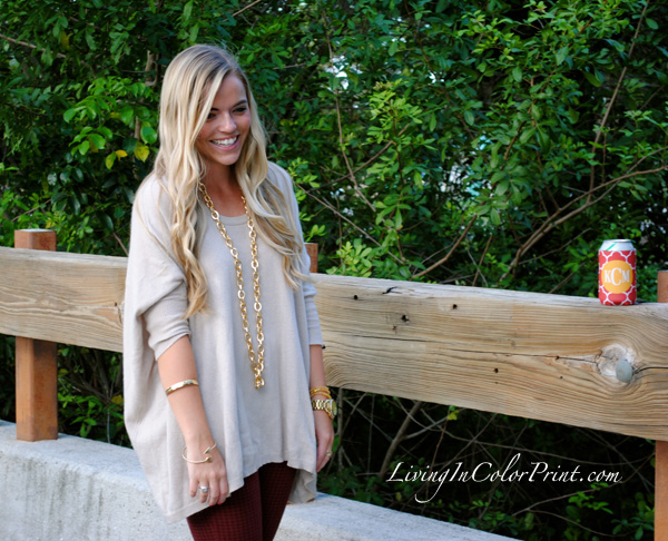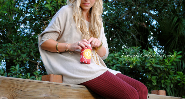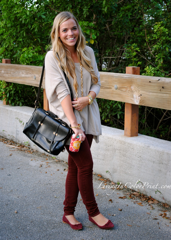 Today I’m rocking these uh-mazingly perfect burgundy, or we can say garnet, hounsdtooth skinnies from our lovely sponsor Paige Denim. I’ve paired them with an oversized beige sweater and gold accessories. I’m usually not a mathy-matchy person when it comes to shoes, but seriously…how perf are these MIA flats with the pants?! Love. And what’s gameday with beer {ok, so for those of you reading this that actually know me…you’re aware of that fact that I’m not a beer gal}. Yes, I’m that girl that brings mini wine bottles or hey, even champagne and OJ for mimosas…that’s my version of a ‘cold one’ on gameday, but you better believe I’ll be rocking my monogram koozie all the way to the stadium.