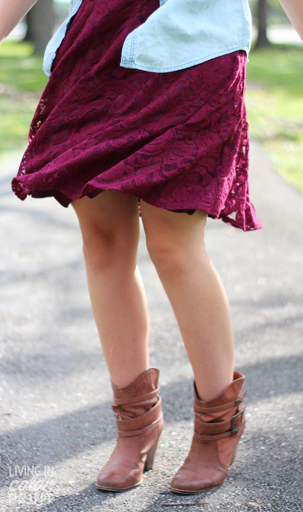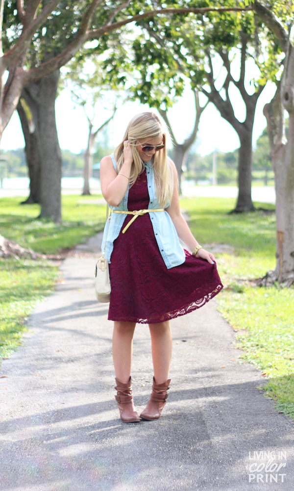 It today’s look, we’ve partnered with Donna Morgan – I’ve chosen to dress down this adorable lace fit & flare with rustic booties, a denim vest, and crossbody bag. This is a super easy way to make a dress wearable on gameday!