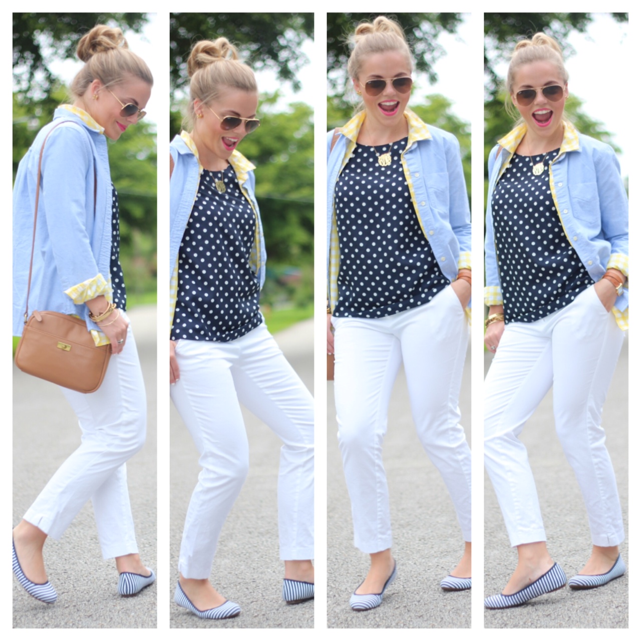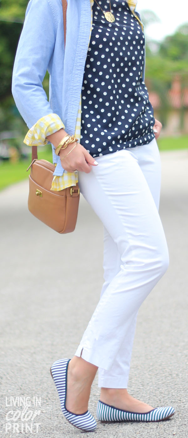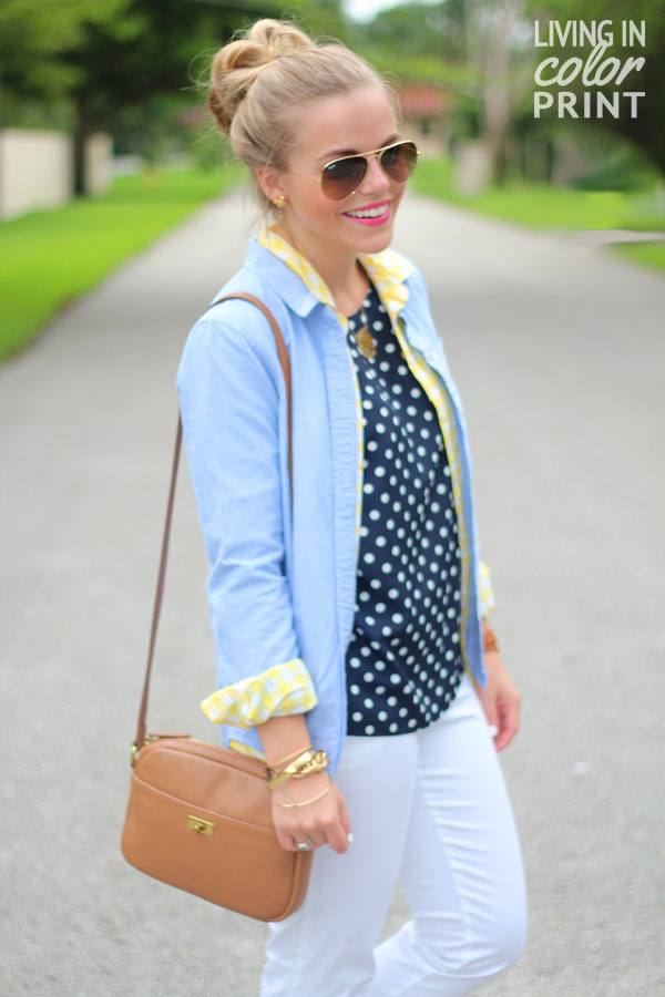 Pants: c/o Warehouse // Shoes: c/o Dr. Scholl’s Shoes // Polka Dot Blouse: J Crew // Yellow Button Down: Old Navy // Chambray Button Down: Madewell // Handbag: J Crew {similar} // Sunnies: Ray Ban // Necklace: c/o Eve’s Addiction // Bracelets: c/o Derng, Kate Spade, random