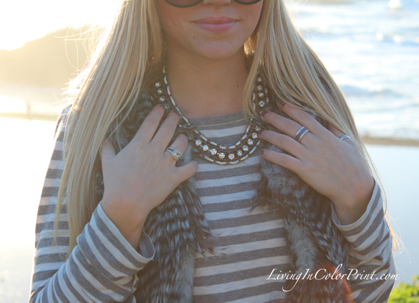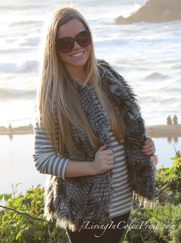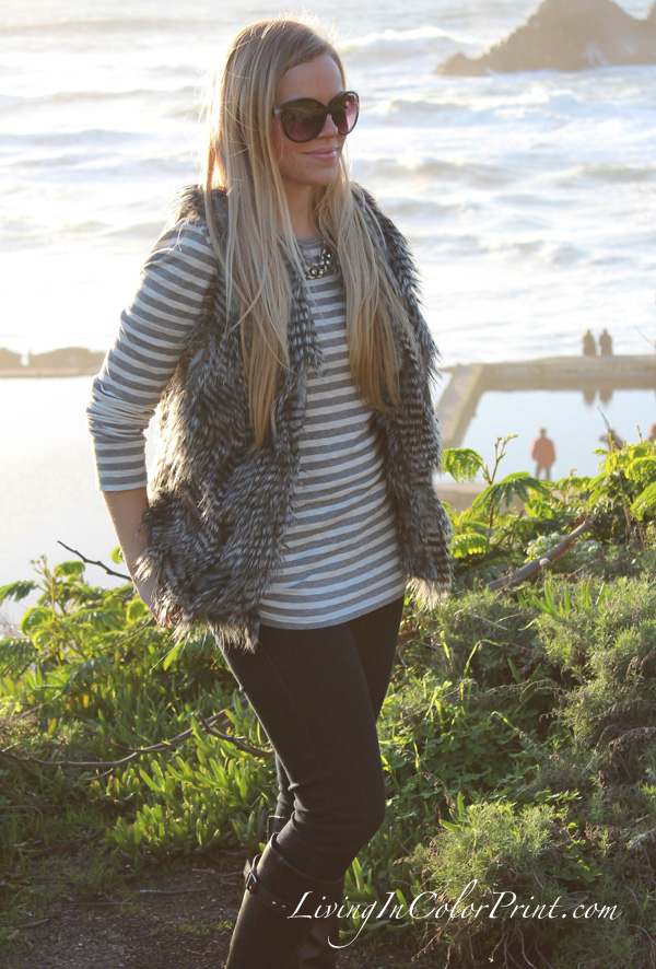 The first day of my 3ish week stay we went to Lands End and I set eyes on the Golden Gate Bridge for the first time ever…breathtaking. The view was just gorgeous: beaming sunlight, waves crashing against the rocks, sharp cliffs, twisted trees, oh yeah, and the Golden Gate Bridge. This Karen Kane faux fur vest was the perfect attire for my day of exploring, not too heavy but just the right amount of fuzz to keep me cozy in the midst of the brisk ocean breeze. I paired it with my go-to jeans, basic yet similar color palette stripe shirt and this a-mazeing {I don’t want to take off} statement necklace by Sira & Mara.