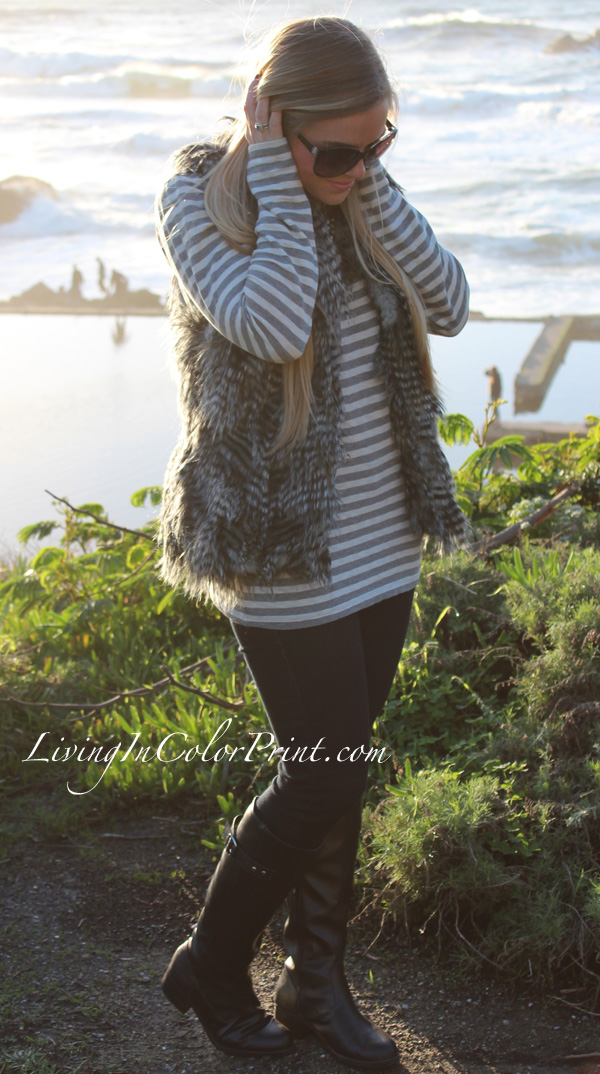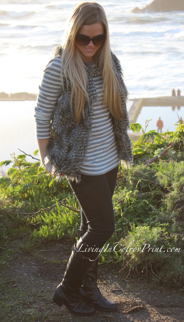 I love the fur vest. Comboed with the stripes, it’s the perfect casual outfit!