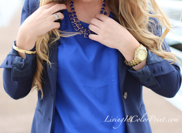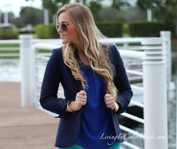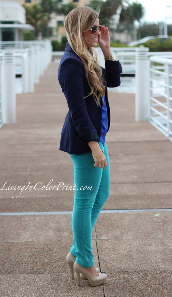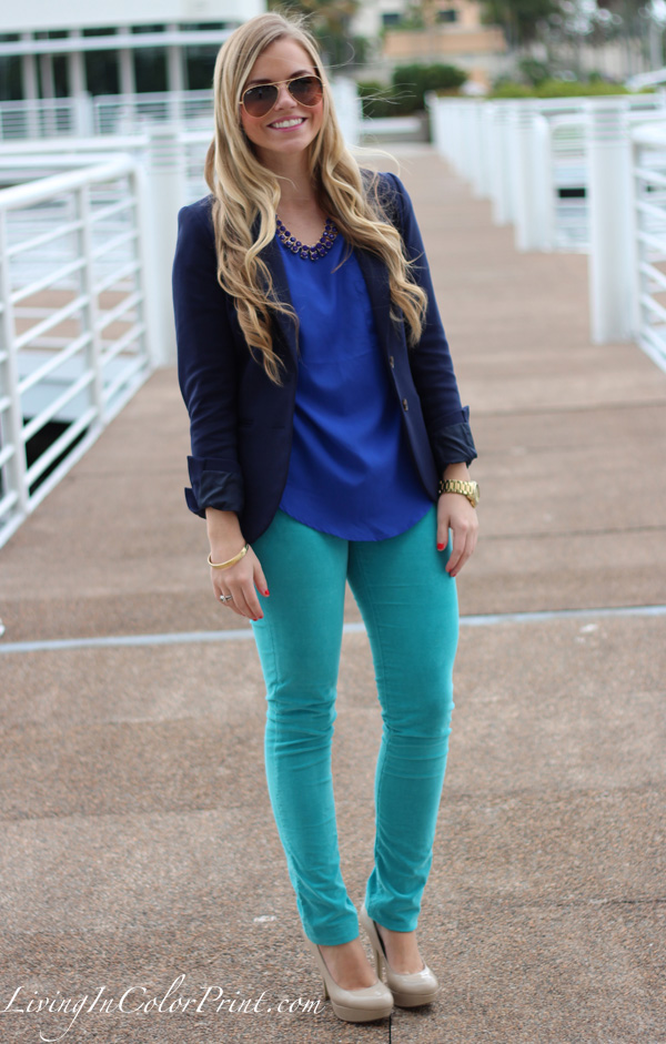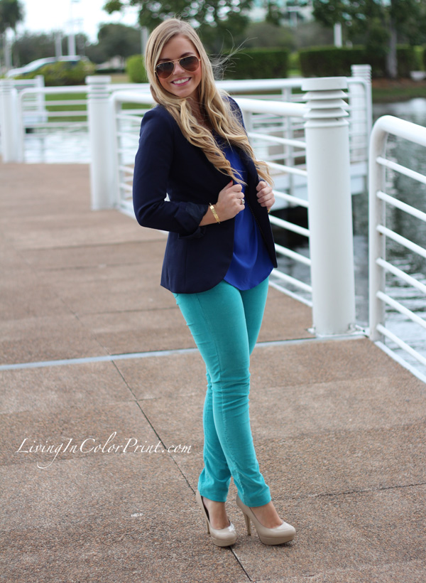 I’ve paired these turquoise David Kahn jeans with a cobalt blouse and navy blazer.